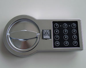Электронный кодовый замок, например замок электронный кодовый M-LOCKS EM1620. Привод запирающих ригелей сейфа осуществляется за счет их перемещения от ручки замка. Запирание может производиться по 3 направлениям.