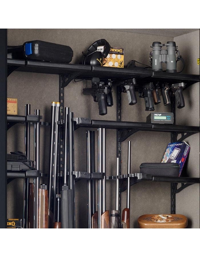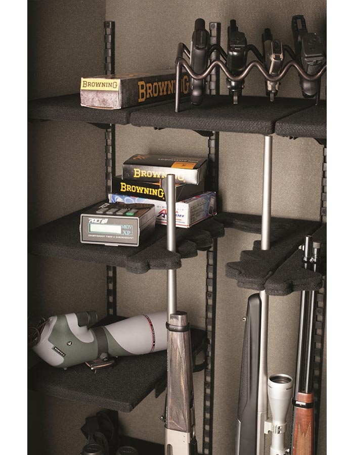 Сейф BROWNING PP49FE предназначен для хранения максимум 20 или 33 стволов высотой до 1390 мм (13 стволов при установленных полках + 7 стволов на двери сейфа или 26 стволов при снятых полках + 7 стволов на двери).