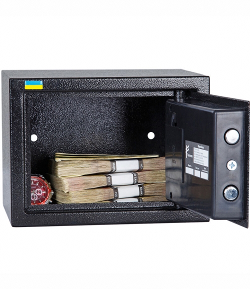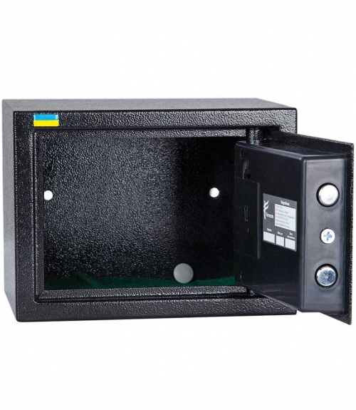 - Сейф оборудован электронным кодовым замком с возможностью отпирания ключем аварийного вскрытия в случае утери кода либо при разряде элементов питания замка.