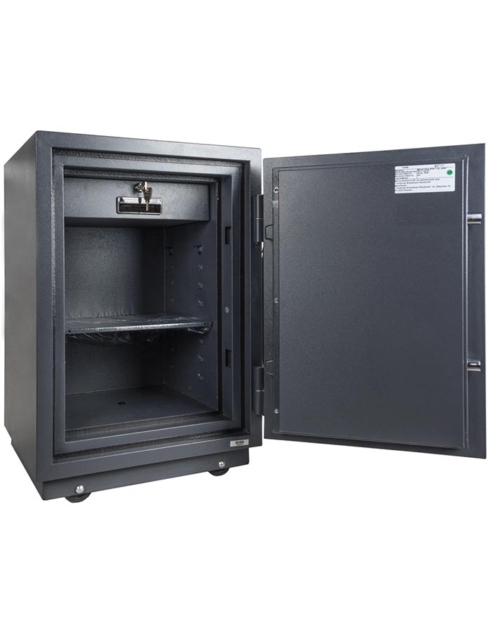 - Пространство между стенками корпуса и двери сейфа заполнено огнестойким бетоном. Противопожарная защита в течение 60 минут, подтвержденная сертификатом согласно ГОСТ Р 50862-2005, класс 60Б.
