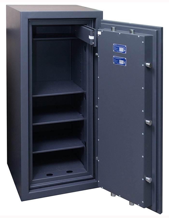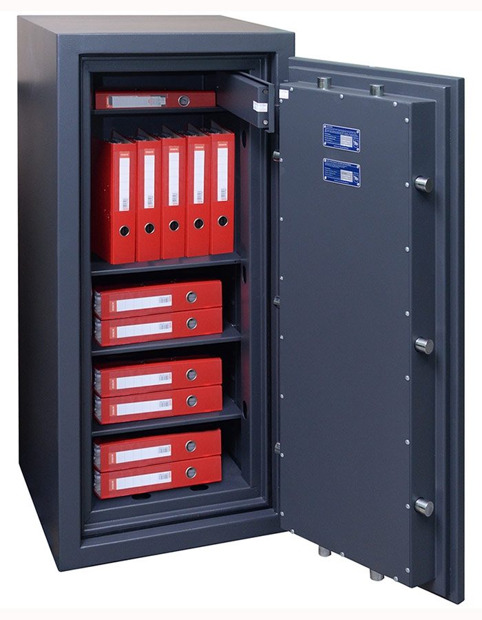 - Оборудован комбинацией ключевого сувальдного замка STUV (Германия - класса VDS1, class A) и электронным кодовым сейфовым замком M-LOCKS (Нидерланды) высокой секретности, сертифицированным на соответствие международным стандартам (класс VDS2, class B). Отпирание сейфа происходит после открытия по очереди обоих замков.