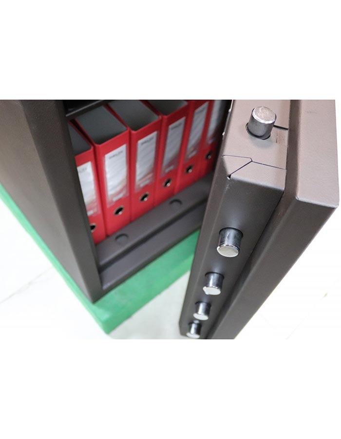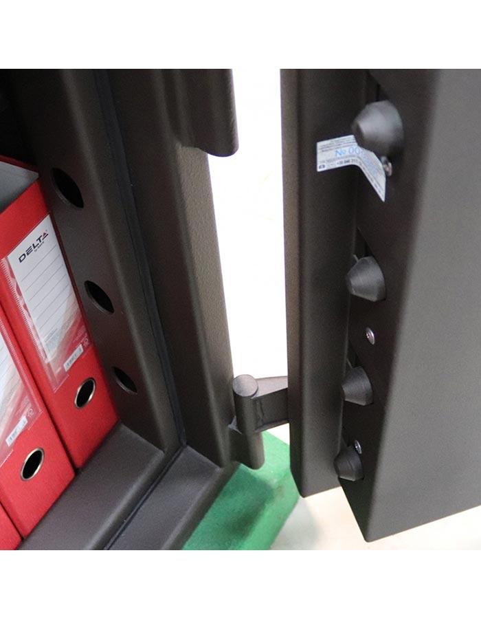 - Дверь сейфа оборудована мощной ригельной системой запирания четырехстороннего действия.