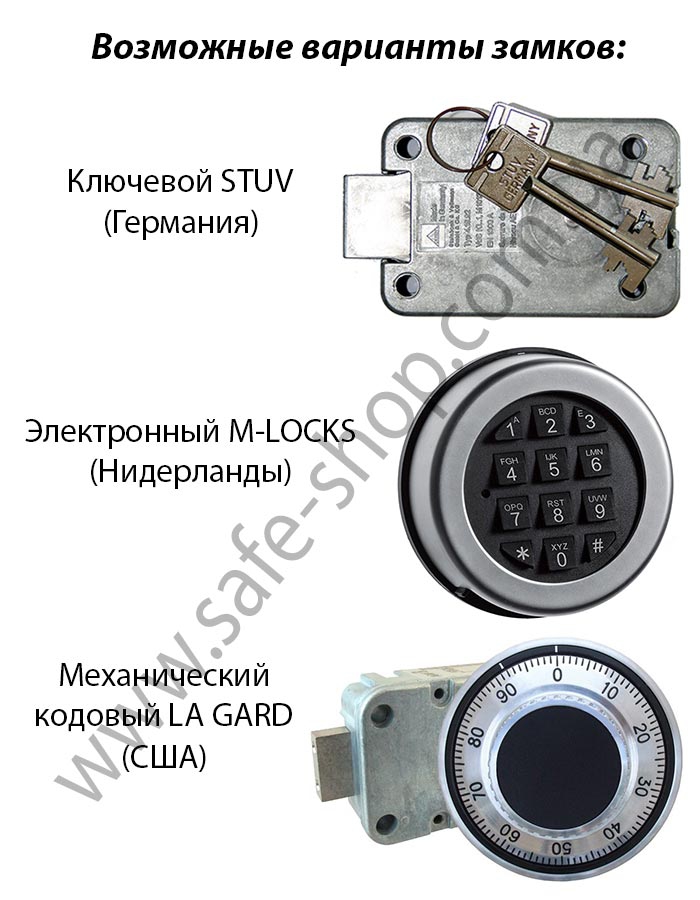 - Замки: В зависимости от модификации сейфы комплектуются ключевыми или комбинационными замками, сертифицированными на соответствие ДСТУ 4012.3-2001: «Carl Wittkopp» (Германия), «Steinbach & Vollmann» (Германия), La Gard (США).