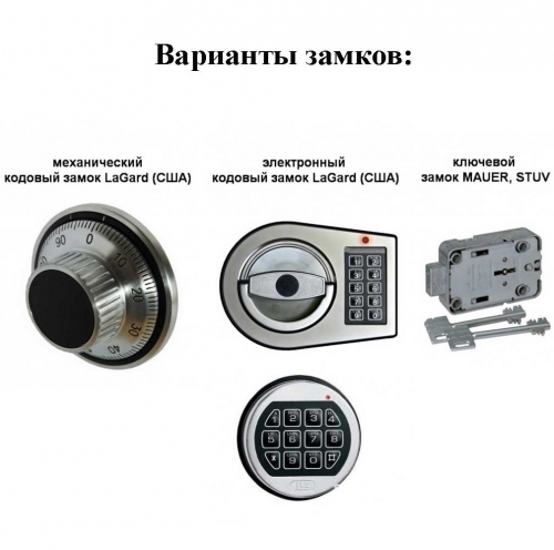 - Замки: В зависимости от модификации сейфы комплектуются ключевыми или комбинационными замками, сертифицированными на соответствие ДСТУ 4012.3-2001: «Carl Wittkopp» (Германия), «Steinbach & Vollmann» (Германия), La Gard (США).