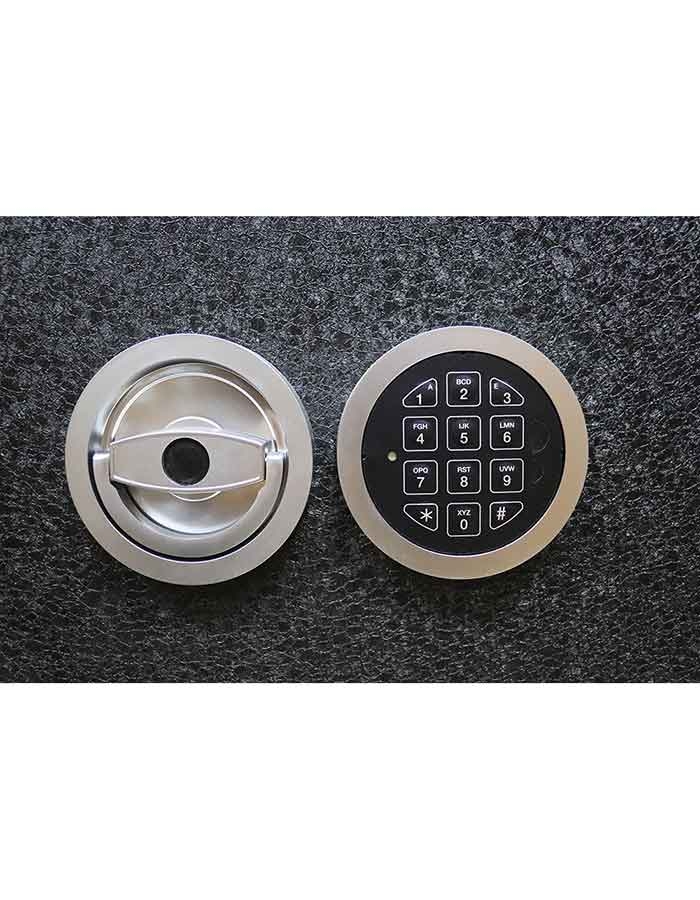 - Оборудован электронным кодовым замком M-LOCKS (Нидерланды) высокой секретности, сертифицированным на соответствие международным стандартам (класс VDS2, class B).Замок питается от батареи типа „крона” (9 В), которая находится в середине сейфа. Время ее функционирования 1,5-2 года. Если батарея разряжается ниже допустимого уровня - то при каждом открытии замка будет звучать длительный звуковой сигнал предупреждения. Если же ее все таки не успеют заменить - то на внешней части замка находятся две клеммы, приложив к которым другую батарею, Вы сможете запитать замок, ввести код и отворить сейф.Электронный кодовый замок разрешает устанавливать 6 цифр в кодовую комбинацию. После 4-х попыток ввода неверного кода замок сейфа автоматически блокируется на 5 минут.