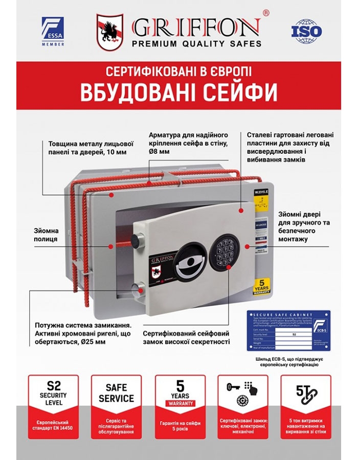 - Сейф сертифицирован по устойчивости к взлому класс S2 согласно EN 14450:2005, что подтверждено результатами испытаний органа сертификации ECB-S (Германия).