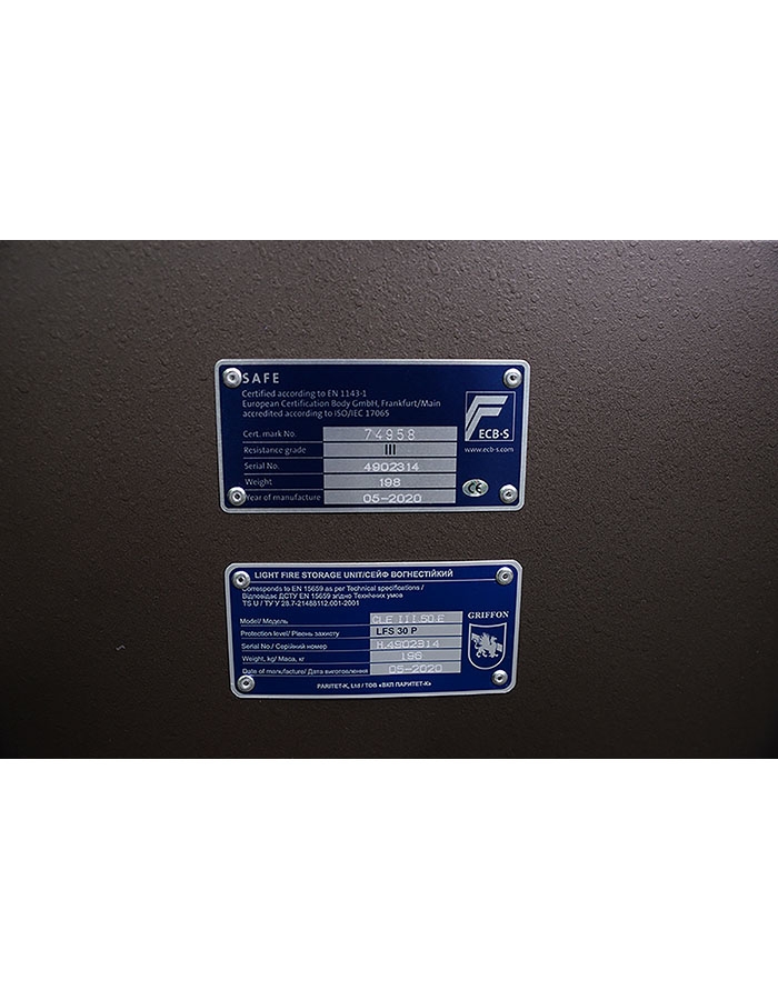 Устойчивость к взлому: Grade III в системе ECB-S (Европейский орган сертификации - DAkkS (Германия). Огнестойкость ДСТУ EN15659:2014 класс LFS 30P (сертификат прилагается).