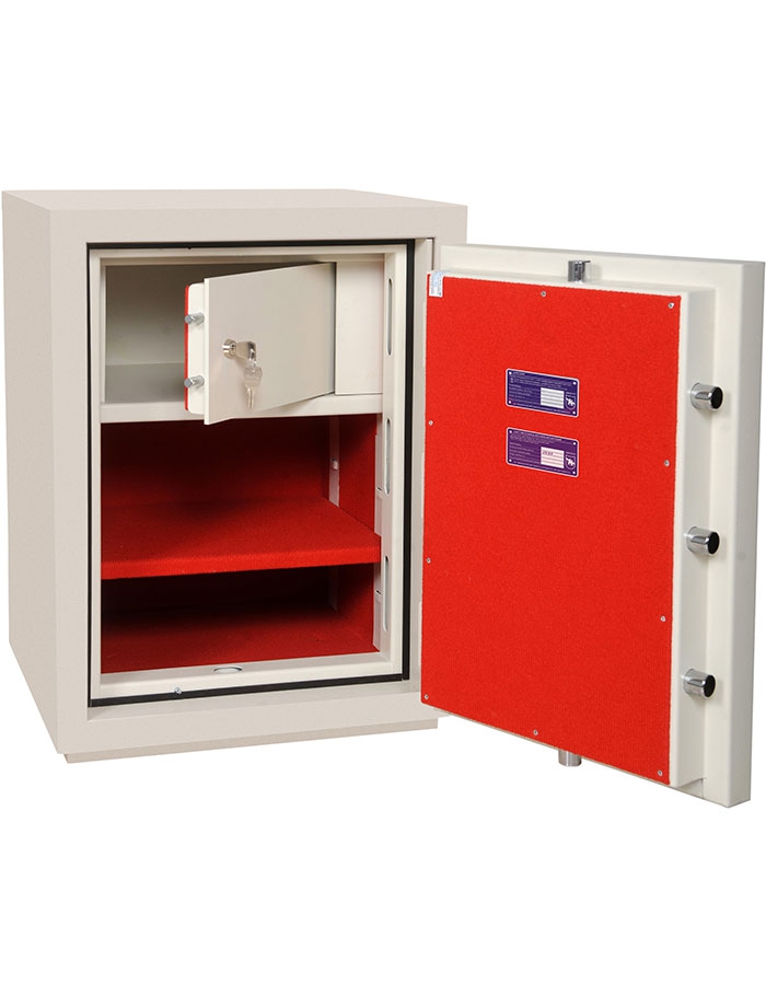 - Оборудован комбинацией ключевого сувальдного замка KABA MAUER VAROS (Германия - класса VDS2, class B) сейфового типа и электронного кодового замка WITTKOPP SWINGLOX (Германия) высокой секретности, сертифицированным на соответствие международным стандартам (класс VDS2, class B). Отпирание сейфа происходит после открытия по очереди обоих замков.