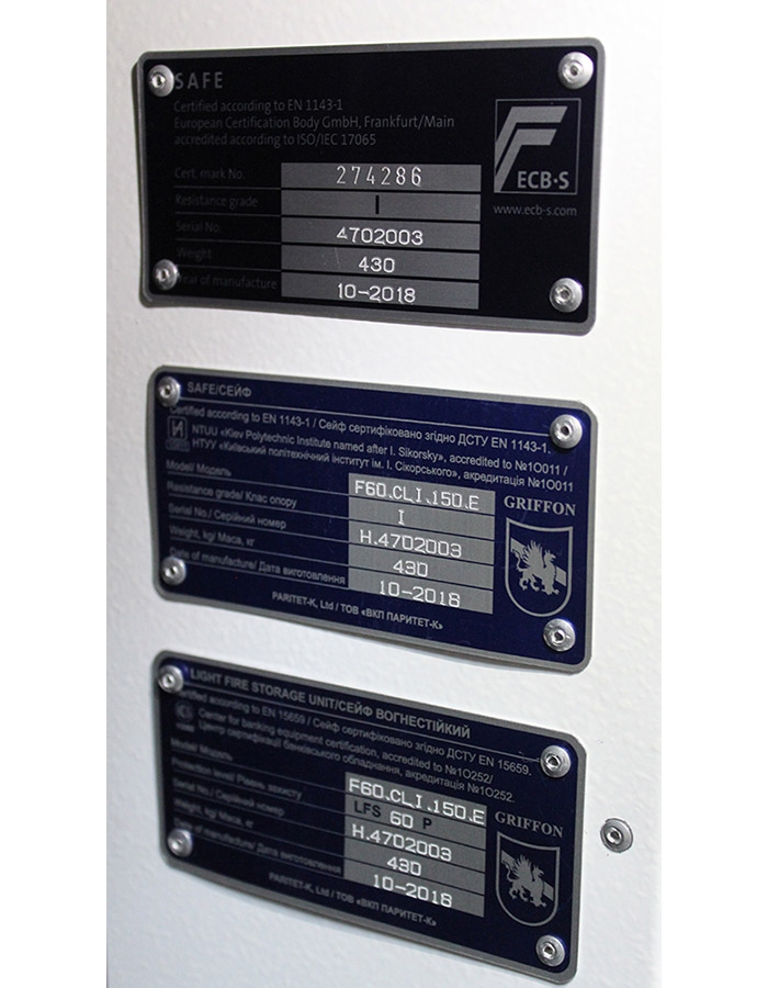 - Пространство между стенками корпуса и двери сейфа заполнено огнестойким бетоном. Противопожарная защита в течение 60 минут, подтвержденная сертификатом согласно ДСТУ EN15659:2014 класс LFS 60P.