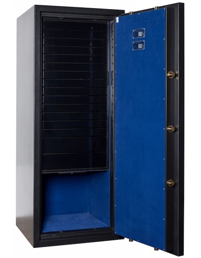 - Оборудован электронным кодовым замком M-LOCKS (Нидерланды) высокой секретности, сертифицированным на соответствие международным стандартам по классу VdS2, Class B + Ключевой сейфовый замок STUV (Германия), сертификат класса VDS 1,Электронный замок питается от батареи типа „крона” (9 В), которая находится в середине сейфа. Время ее функционирования 1,5-2 года. Если батарея разряжается ниже допустимого уровня - то при каждом открытии замка будет звучать длительный звуковой сигнал предупреждения. Если же ее все таки не успеют заменить - то на внешней части замка находятся две клеммы, приложив к которым другую батарею, Вы сможете запитать замок, ввести код и отворить сейф.Электронный кодовый замок разрешает устанавливать 6 цифр в кодовую комбинацию. После 4-х попыток ввода неверного кода замок сейфа автоматически блокируется на 5 минут.