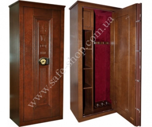 - Комплектация EL GOLD - сейф изготовлен из высокопрочной стали и имеет высококлассную внешнюю и внутреннюю отделку массивом дуба. Полки, лицевая панель патронного отделения и внутренние перегородки сейфа выполнены из натурального дерева, все внутренние поверхности сейфа обшиты качественным бархатом темно-бордового цвета. Замок сейфа покрыт позолотой.