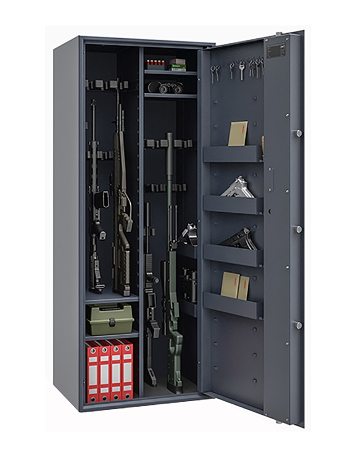 - Оборудован боковыми карманами на внутренней стороне двери и на внутренней боковой стенке сейфа для комфортного размещения боеприпасов.