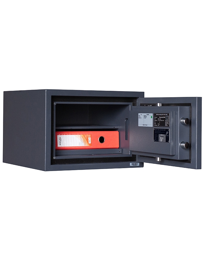 - Пространство между стенками корпуса и двери сейфа заполнено огнестойким бетоном. Противопожарная защита в течение 30 минут, подтвержденная сертификатом согласно EN 15659, класс LFS 30P.