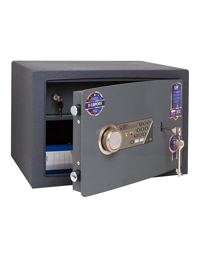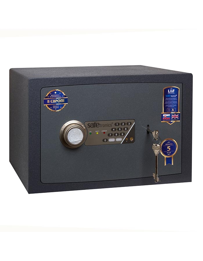 - Сейф оборудован электронным кодовым замком Safetronics и ключевым сувальдным замком Mauer (Германия). Электронный кодовый замок имеет 1 млн. возможных комбинаций, после третьего неправильного набора кода сейф на некоторое время блокируется. Замок сейфа не требует внешнего источника электропитания. Элемент питания - батарейки типа ААА - 4 шт (входят в комплект поставки), время их функционирования 1,5-2 года. Отображение технического состояния замка на светодиодных индикаторах.