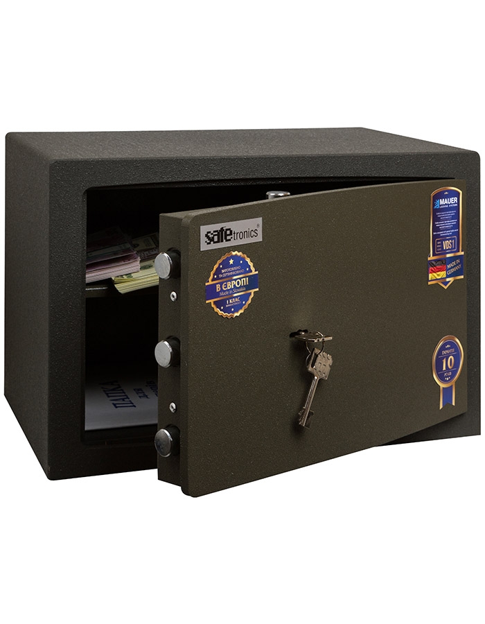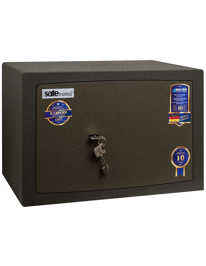 - Сейф оборудован ключевым сертифицированным сейфовым замком Mauer (Германия) класса VDS 1 (в комплекте 2 ключа, длина ключа 65 мм).