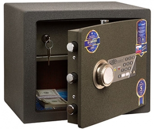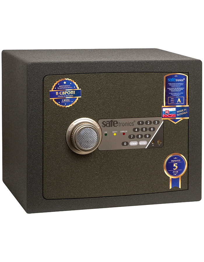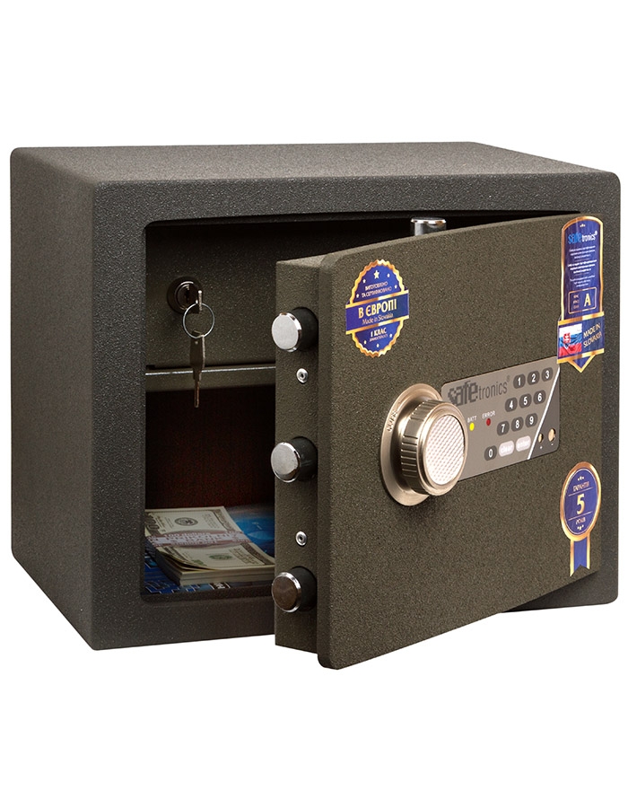 - Сейф оборудован электронным кодовым замком Safetronics. Электронный кодовый замок имеет 1 млн. возможных комбинаций, после третьего неправильного набора кода сейф на некоторое время блокируется. Замок сейфа не требует внешнего источника электропитания. Элемент питания - батарейки типа ААА - 4 шт (входят в комплект поставки), время их функционирования 1,5-2 года. Отображение технического состояния замка на светодиодных индикаторах.