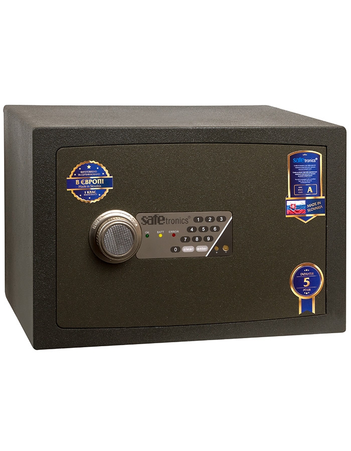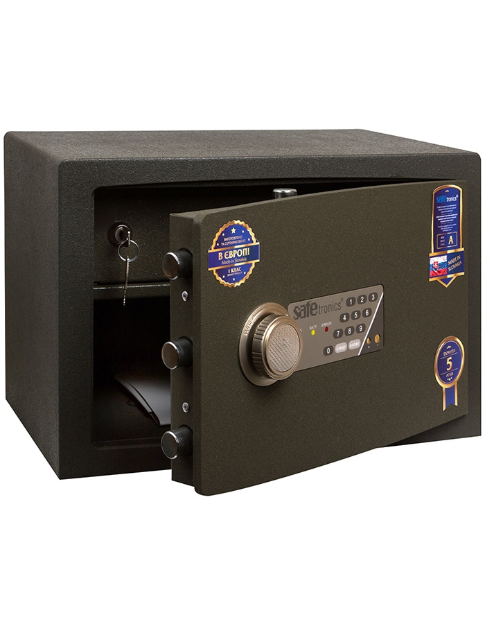 - Сейф оборудован электронным кодовым замком Safetronics. Электронный кодовый замок имеет 1 млн. возможных комбинаций, после третьего неправильного набора кода сейф на некоторое время блокируется. Замок сейфа не требует внешнего источника электропитания. Элемент питания - батарейки типа ААА - 4 шт (входят в комплект поставки), время их функционирования 1,5-2 года. Отображение технического состояния замка на светодиодных индикаторах.