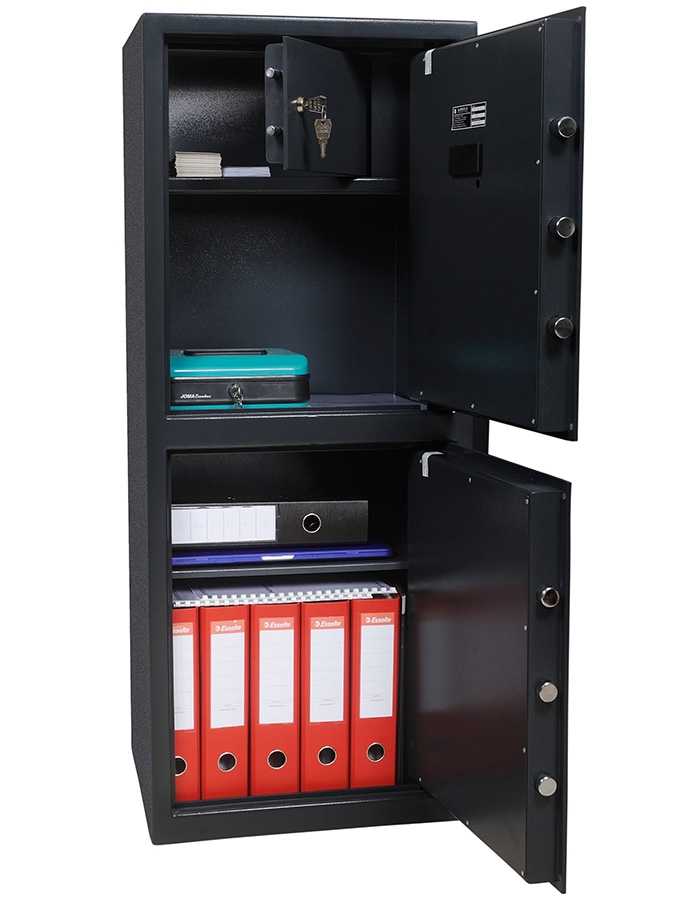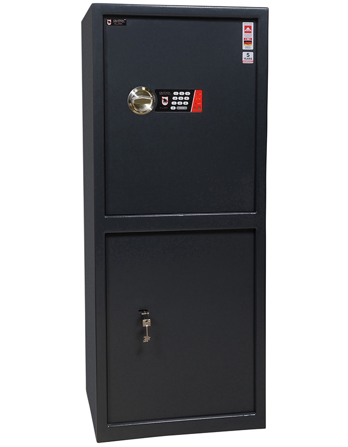 - Нижняя секция сейфа оборудована ключевым сейфовым замком Lowe & Fletcher.