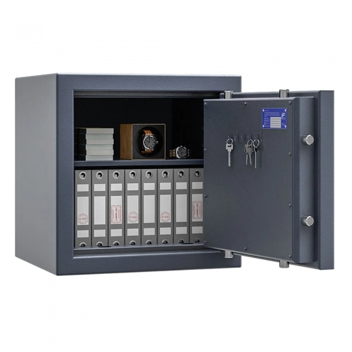 - Сейф вмещает 6 папок. Имеется 1 регулируемая по высоте полка и 5 крючков для ключей на внутренней стороне двери.