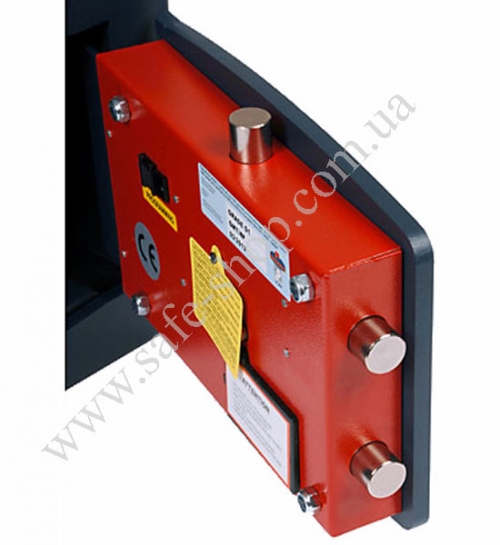 - Оборудован электронным кодовым замком (TECHNOMAX) высокой секретности.Замок питается от четырех щелочных элементов питания типа „АА” (1,5 В), которые находятся в середине двери сейфа. Если батареи разряжаются ниже допустимого уровня - сработает индикация, которая укажет на это. В случае, если их все-таки не успеют заменить, то на лицевой панели клавиатуры замка находятся две клеммы, приложив к которым новую щелочную батарею типа "Крона" (9В), Вы можете запитать электрическую схему замка, ввести свой код и открыть сейф, после чего произвести замену вышедших из строя батареек.