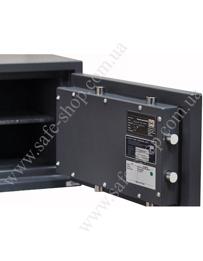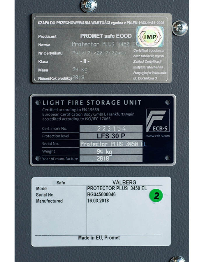 - Пространство между стенками корпуса и двери сейфа заполнено огнестойким бетоном. Противопожарная защита в течение 30 минут, подтвержденная сертификатом согласно EN 15659, класс LFS 30P.