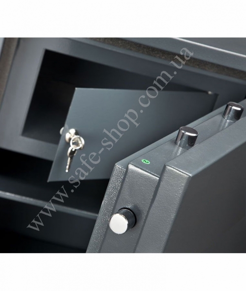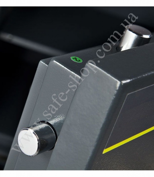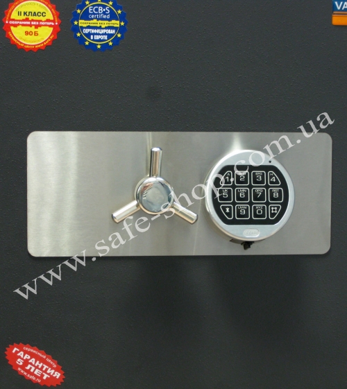 - Оборудован электронным кодовым замком высокой секретности, сертифицированный по классу VDS2.Замок питается от батареи типа „крона” (9 В), которая находится в середине замка сейфа. Время ее функционирования 1-1,5 года. Если батарея разряжается ниже допустимого уровня - то при каждом открытии замка будет звучать длительный звуковой сигнал предупреждения. Батарею следует заменить, предварительно сняв защитную крышку в нижней части замка.Электронный кодовый замок разрешает устанавливать 6 цифр в кодовую комбинацию. После 4-х попыток ввода неверного кода замок сейфа автоматически блокируется на 5 минут.