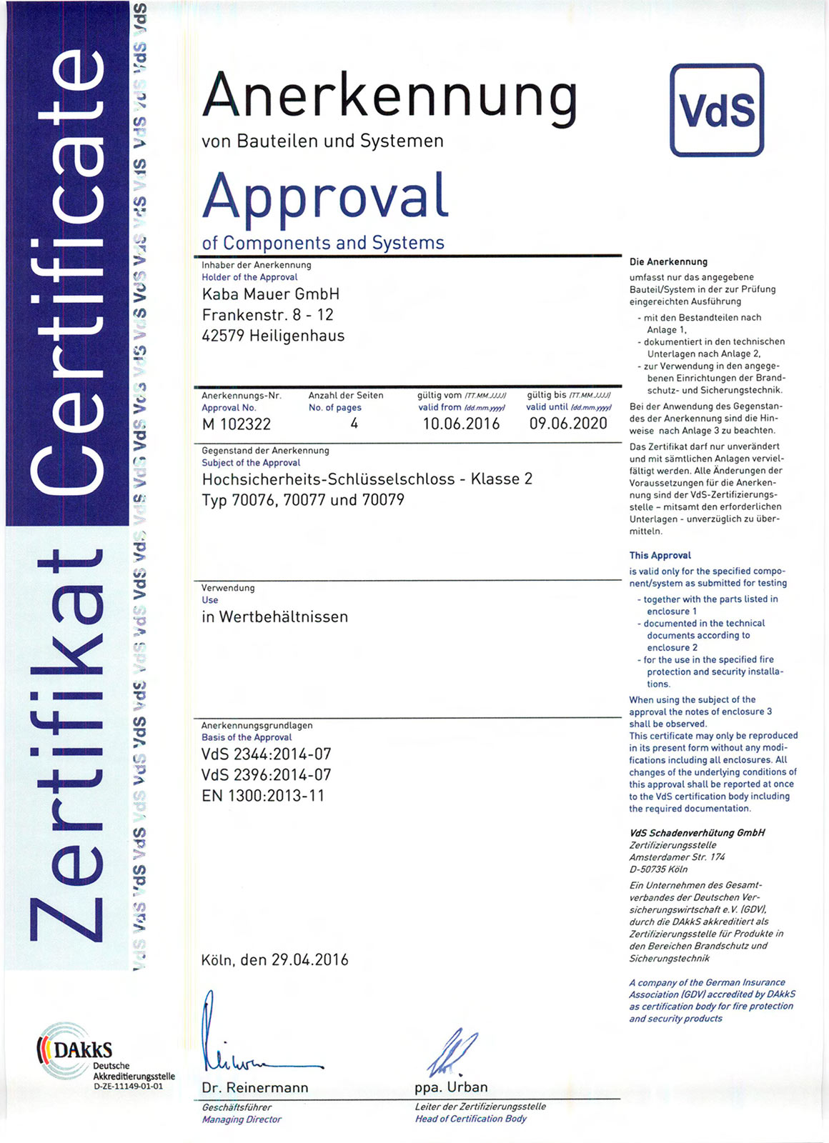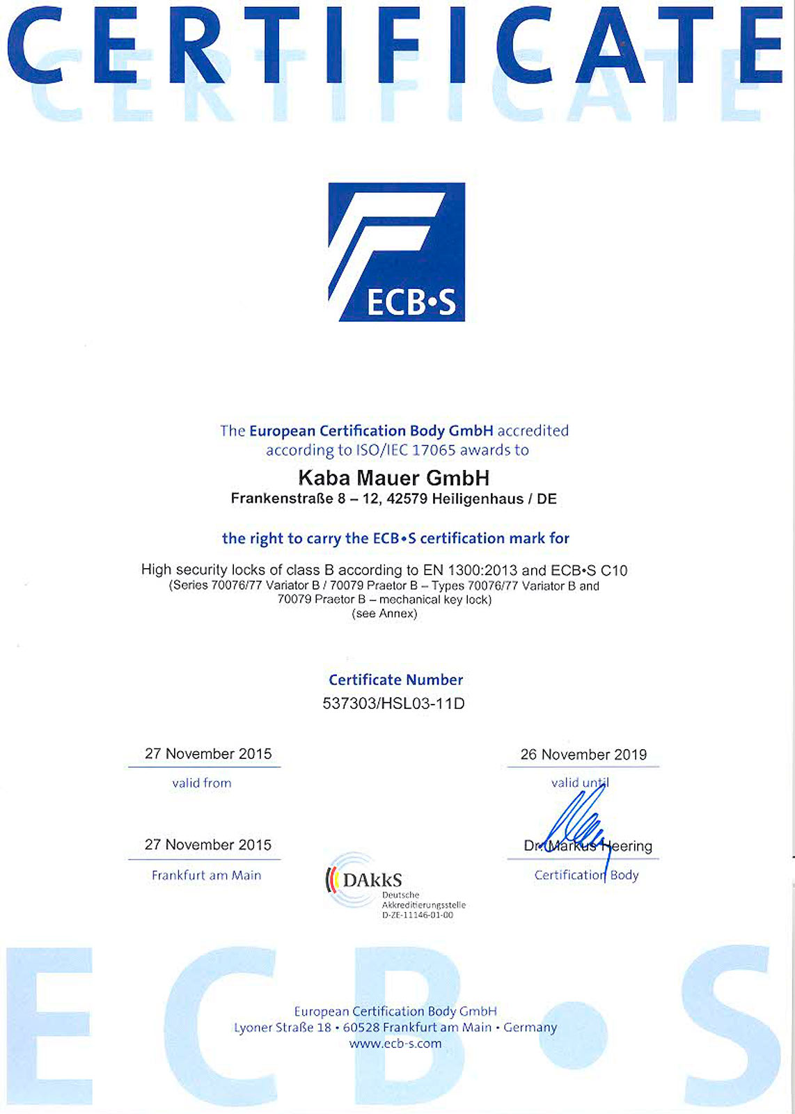 ГОСТ класс B, EN 1300 class B, VdS class 2.